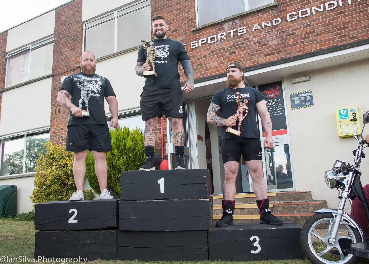 The whole day was a great spectacle, spread over the entire length and breadth of Rhinos carpark some 80 metres in length. With the events finishing at 5pm proceedings moved from the main carpark to the podium at the front of the gym, where the athletes received medals and fantastic trophies from the legendary Geoff Capes.